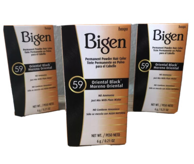 Below are the available bulk discount rates for each individual item when you purchase a certain amount. Bigen permanent powder hair color 59 oriental black, 0.21 oz. Bigen permanent powder hair color leaves your hair looking smooth, natural and elegant. Item is returnable in 30 days and restocking fee may apply. It comes with gloves and a tray, so you can use it right away.